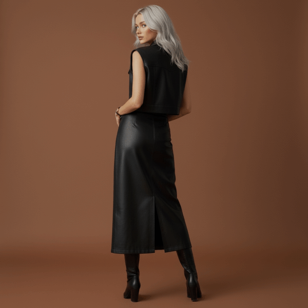 Command attention with this black leather set, featuring a sleek long slit skirt paired with a matching vest adorned with golden buttons. Designed for bold elegance and modern edge, this outfit is perfect for evening events, parties, or high-fashion looks. A powerful statement of luxury, confidence, and contemporary style.