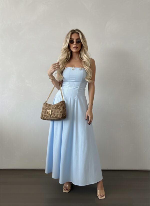 Stand out in style with this blue sea star corset dress, designed with a flattering bustier silhouette and elegant buff detailing. The rich blue tone adds a touch of sophistication, making it perfect for formal events, evening parties, or coastal celebrations. A stunning expression of modern glamour and timeless elegance.