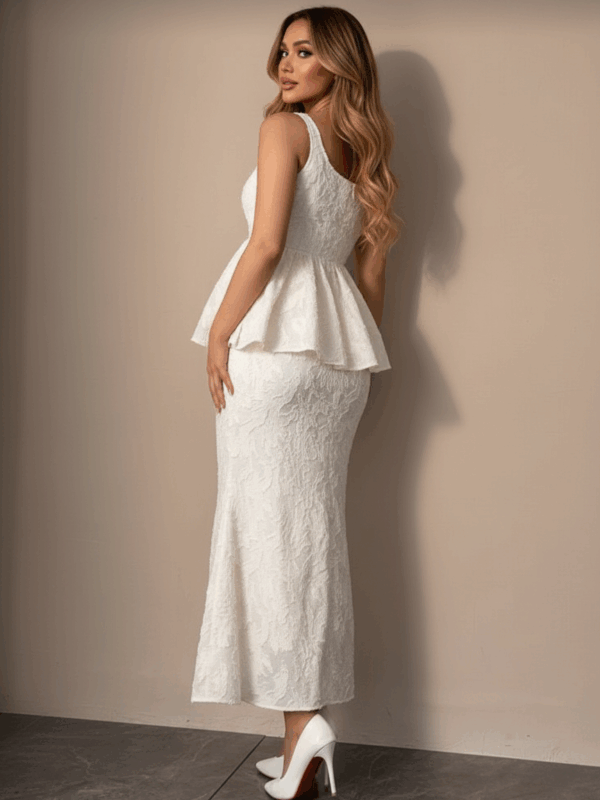 Exude refined elegance in this white two-piece set, featuring a stylish top with graceful waist waves paired with a flowing long skirt. Perfect for formal events, evening gatherings, or sophisticated daytime looks, this outfit blends modern minimalism with timeless femininity, offering a chic and polished appearance.